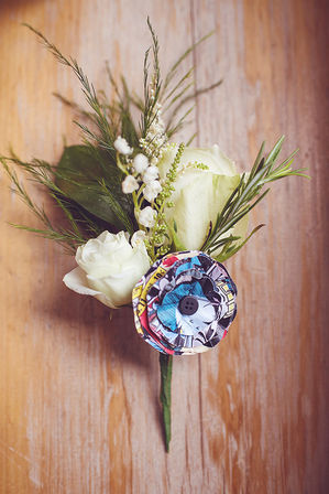Sarah came to our first meeting with paper roses made from comics and wanted me to incorporate their love of quirky comic book heroes with a wild natural look using green and white. Sarah’s dress and look had a very classic Sixties feel, so I wanted to evoke this classic era in my design while staying true to her personal style.